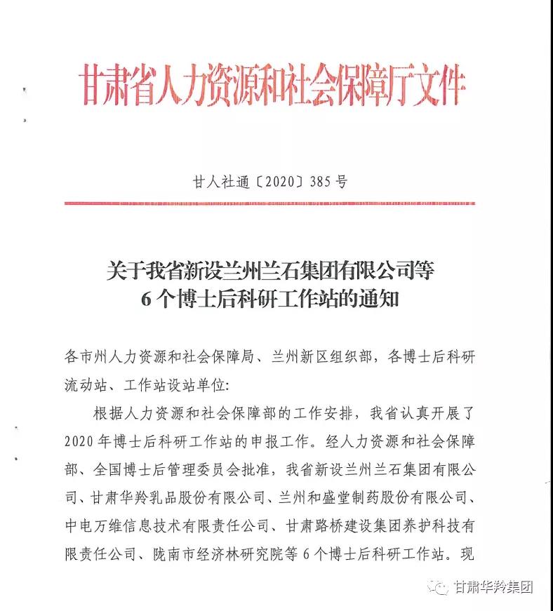 2020年11月30日,經人力資源和社會保障部、全國博士后管理委員會批準,甘肅華羚乳品股份有限公司獲準設立國家級博士后科研工作站。